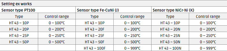 | Sensor types | Fe-CuNi (J), NiCr-Ni (K) with reference point compensation, sensor breakage protection and sensor polarity control PT100 2-wire DIN/IEC |