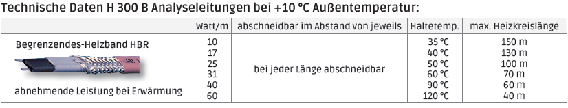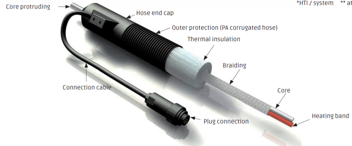 The H 300 B heating hoses with HBR semiconductor heating tapes limit their power on heating. The temperature attained depends on the environmental conditions, A temperature controller may be required, depending on the application, as too high temperatures destroy the semiconductor layer. If temperature differences occur along sections of routed heating hoses, the heating power adapts to the environmental temperature from section to section. This ensures uniform heating overall.